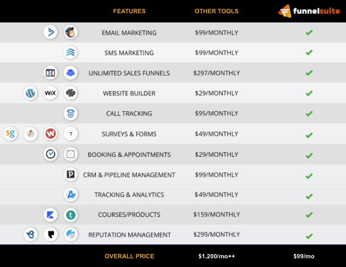With YourFunnelSuite you can replace all these tools and manage all your sales and marketing activities without having to switch between multiple platforms -- keeping your data intact and accurate.